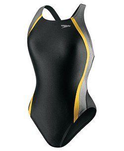 Traje de baño de dama para practicar la natación combinado de color liso y franjas al costado , tirante cruzado en la parte de la espalda y escote pronunciado.