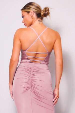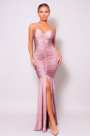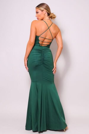 Este elegante vestido largo verde es la personificación del glamour. Confeccionado en un lujoso satén, el vestido presenta un favorecedor escote en V sostenido por delicados tirantes finos. El corpiño está expertamente drapeado, realzando la figura y añadiendo un toque de sofisticación. Una abertura alta en la parte delantera le da un toque de atractivo seductor y permite un movimiento fácil. El color verde intenso es llamativo y elegante, lo que lo hace perfecto para eventos especiales. La modelo complementa el vestido con delicados collares en capas y tacones color nude, completando un conjunto refinado y listo para la alfombra roja.