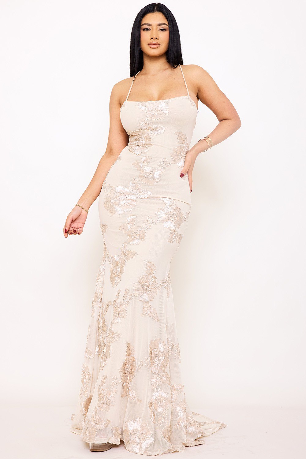 Corte: Silueta tipo sirena que abraza las curvas y fluye en una elegante cola.