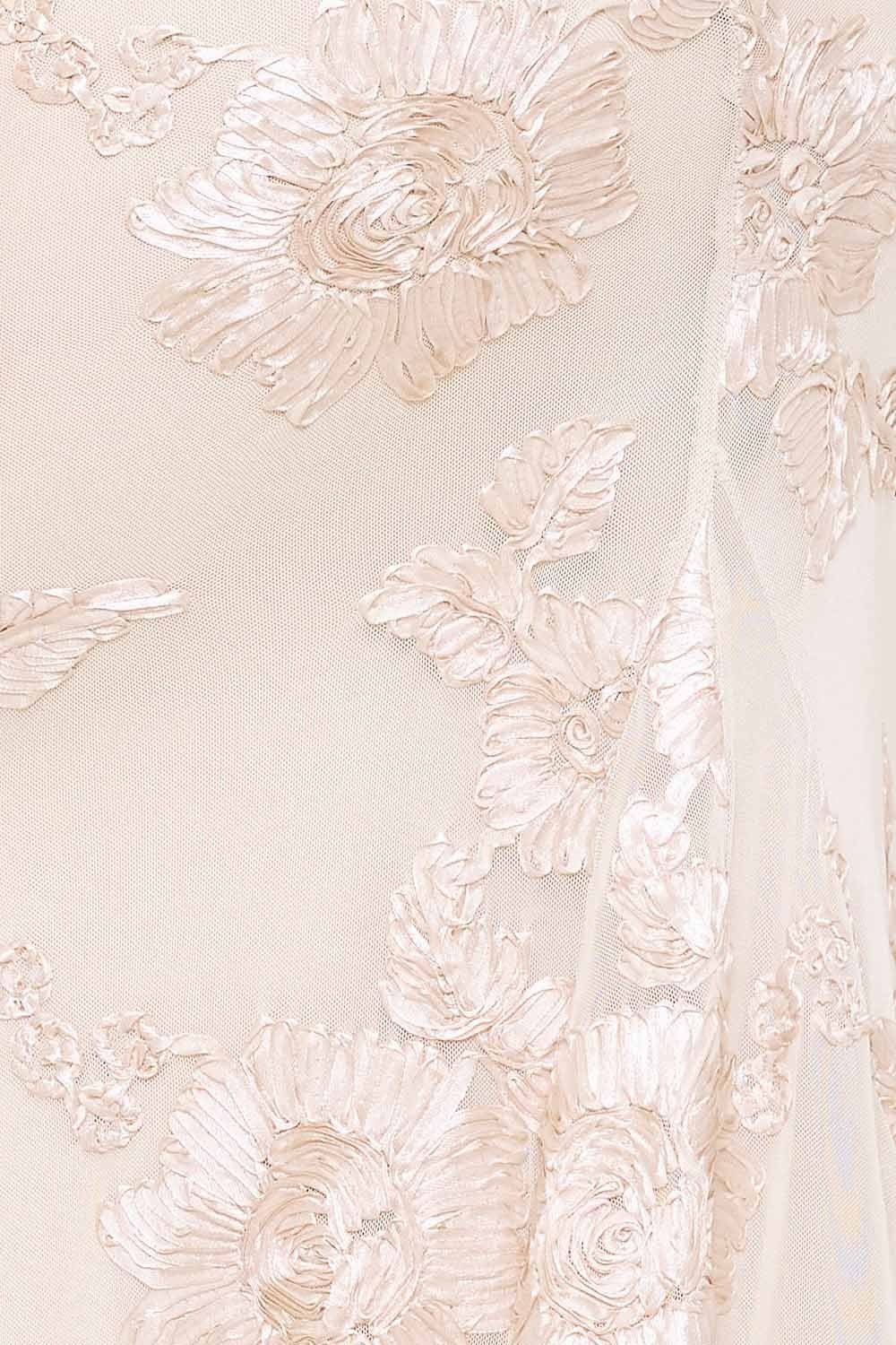 Vestido Largo Ivory. El Arte de la Elegancia: Este vestido ha sido confeccionado para quienes buscan un equilibrio entre sofisticación y sensualidad. Su diseño de corte largo y aplicaciones florales en 3D crea un efecto visual de textura y lujo que no pasa desapercibido.
