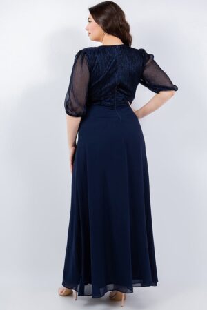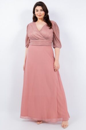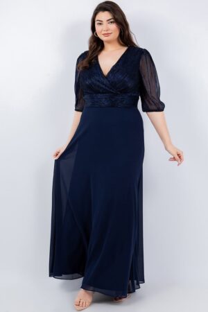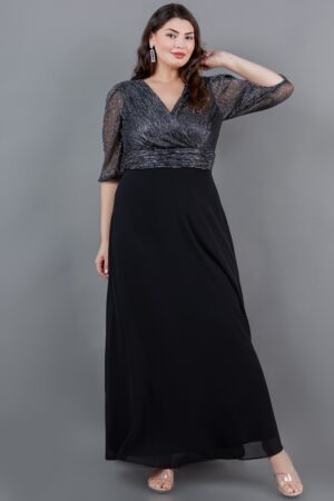Este elegante vestido maxi de talla grande combina sofisticación y comodidad para cualquier ocasión especial. El diseño presenta un deslumbrante brillo metálico en el top, que aporta un toque de glamour y modernidad. Su escote en V envuelve con elegancia, mientras que las mangas tres cuartos con ligero volumen realzan la feminidad y el estilo. La falda fluida cae suavemente, ofreciendo un movimiento grácil al caminar. Ideal para eventos nocturnos o cenas formales, este vestido permite brillar con seguridad y estilo. Confeccionado para realzar la figura, es la elección perfecta para destacar con confianza y elegancia.